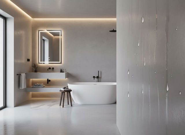 Fugenlose, wasserdichte Oberflächen für Bad, Dusche und Nassbereiche – extrem strapazierfähig, schimmelresistent und mit Rutschfestigkeit R11. Die Verarbeitung spart bis zu 40 % Arbeitszeit und ist sogar ohne Versiegelung wasserdicht.